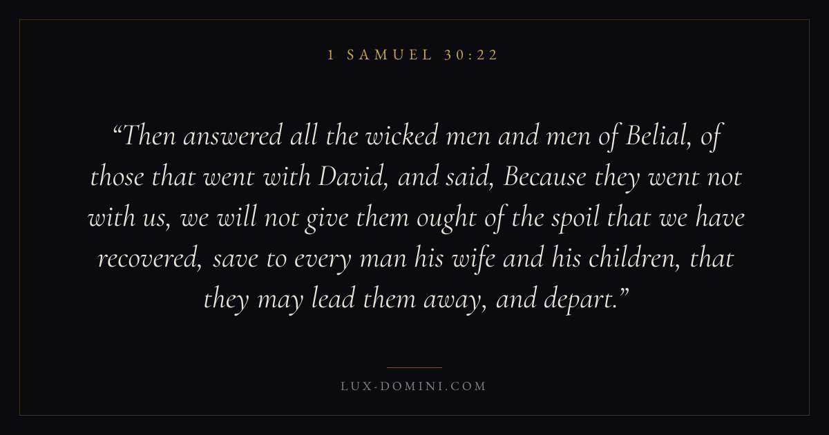 Then answered all the wicked men and men of Belial, of those that went with David, and said, Because they went not with us, we will not give them ought of the spoil that we have recovered, save to every man his wife and his children, that they may lead them away, and depart.