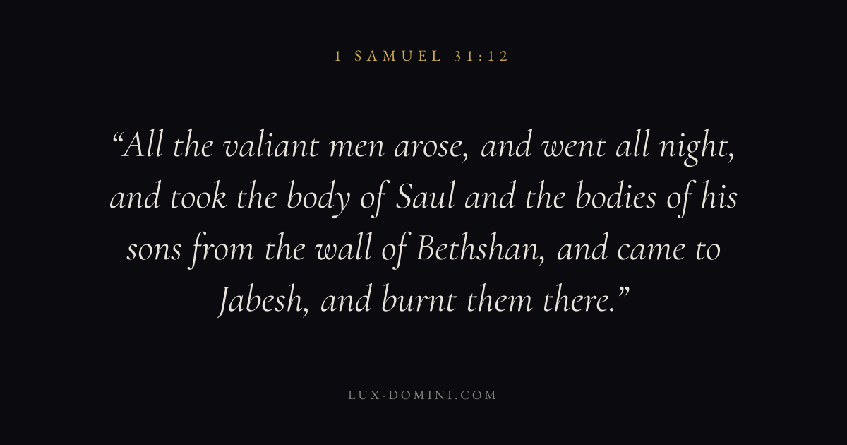 All the valiant men arose, and went all night, and took the body of Saul and the bodies of his sons from the wall of Bethshan, and came to Jabesh, and burnt them there.