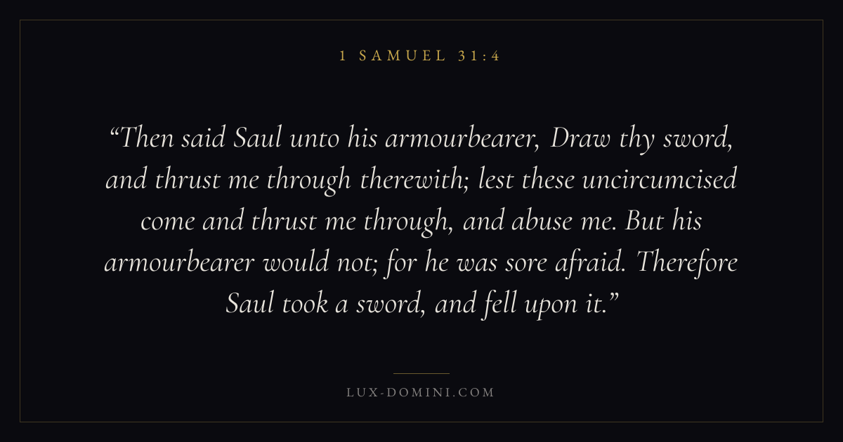 Then said Saul unto his armourbearer, Draw thy sword, and thrust me through therewith; lest these uncircumcised come and thrust me through, and abuse me. But his armourbearer would not; for he was sore afraid. Therefore Saul took a sword, and fell upon it.