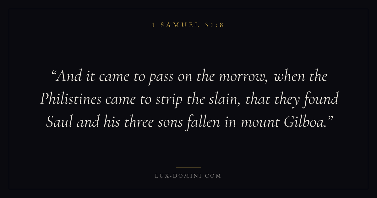 And it came to pass on the morrow, when the Philistines came to strip the slain, that they found Saul and his three sons fallen in mount Gilboa.