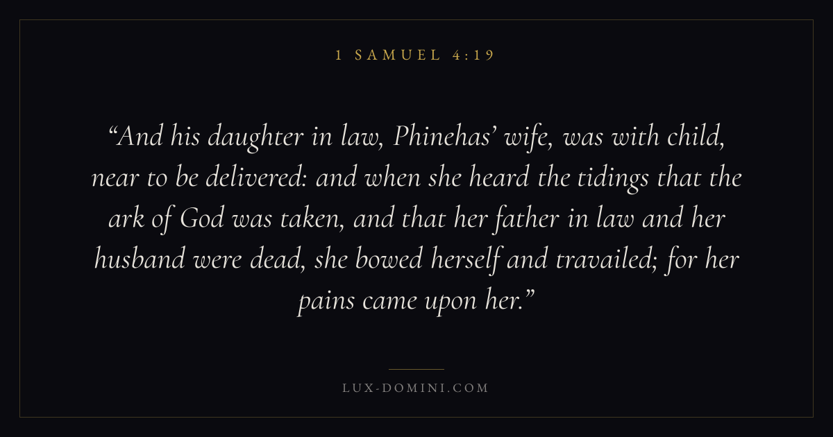 And his daughter in law, Phinehas’ wife, was with child, near to be delivered: and when she heard the tidings that the ark of God was taken, and that her father in law and her husband were dead, she bowed herself and travailed; for her pains came upon her.