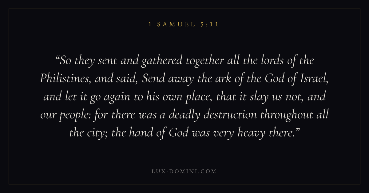 So they sent and gathered together all the lords of the Philistines, and said, Send away the ark of the God of Israel, and let it go again to his own place, that it slay us not, and our people: for there was a deadly destruction throughout all the city; the hand of God was very heavy there.