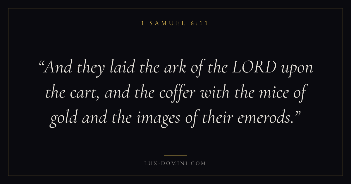 And they laid the ark of the LORD upon the cart, and the coffer with the mice of gold and the images of their emerods.