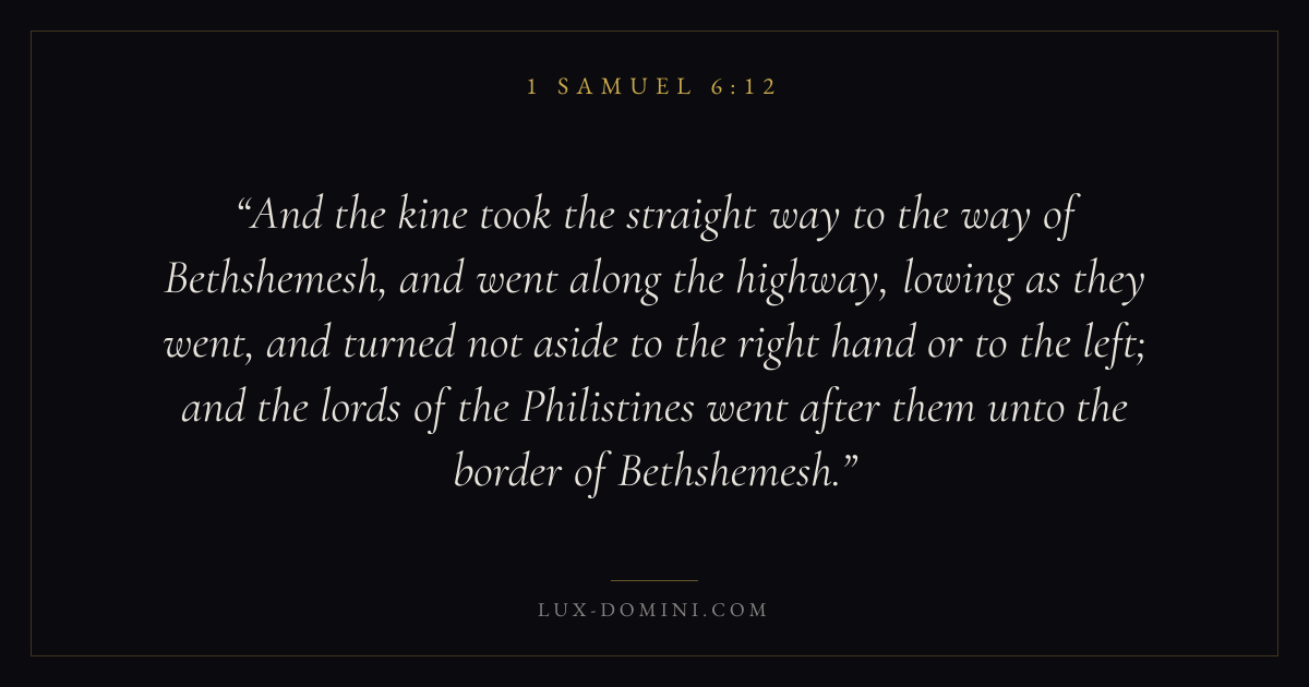 And the kine took the straight way to the way of Bethshemesh, and went along the highway, lowing as they went, and turned not aside to the right hand or to the left; and the lords of the Philistines went after them unto the border of Bethshemesh.