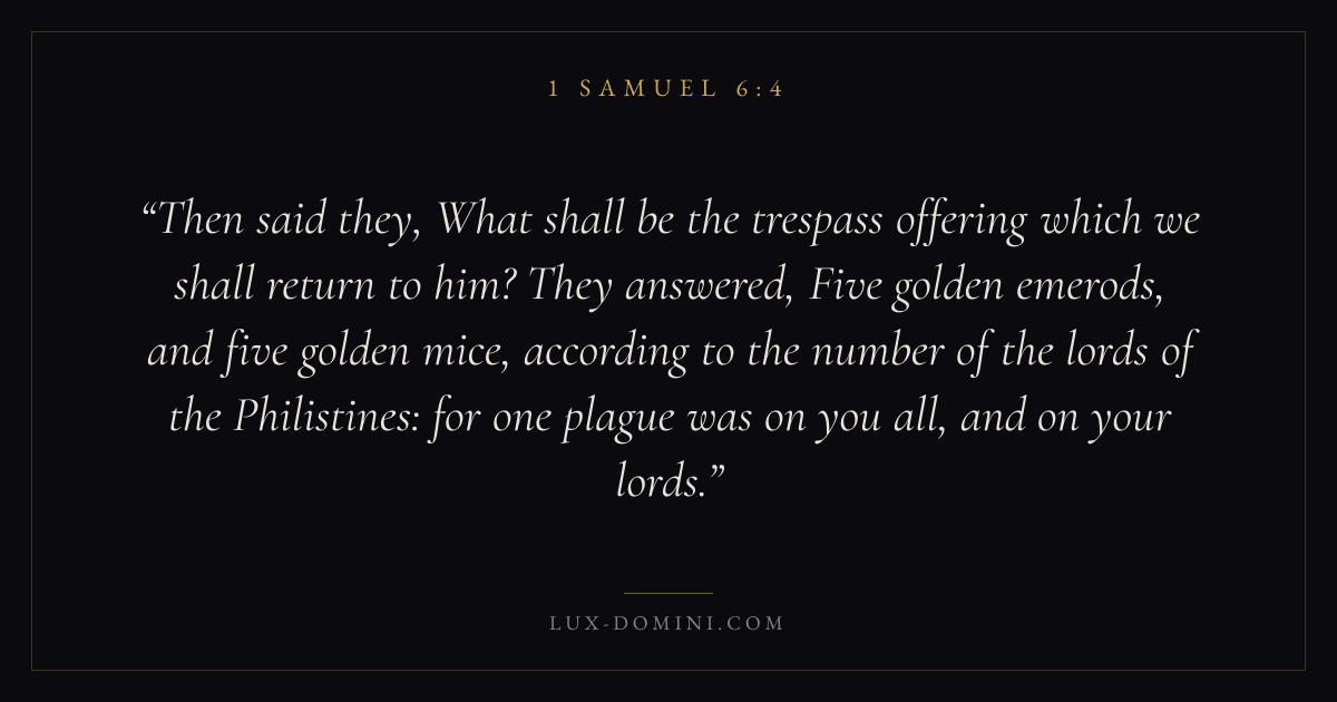 Then said they, What shall be the trespass offering which we shall return to him? They answered, Five golden emerods, and five golden mice, according to the number of the lords of the Philistines: for one plague was on you all, and on your lords.