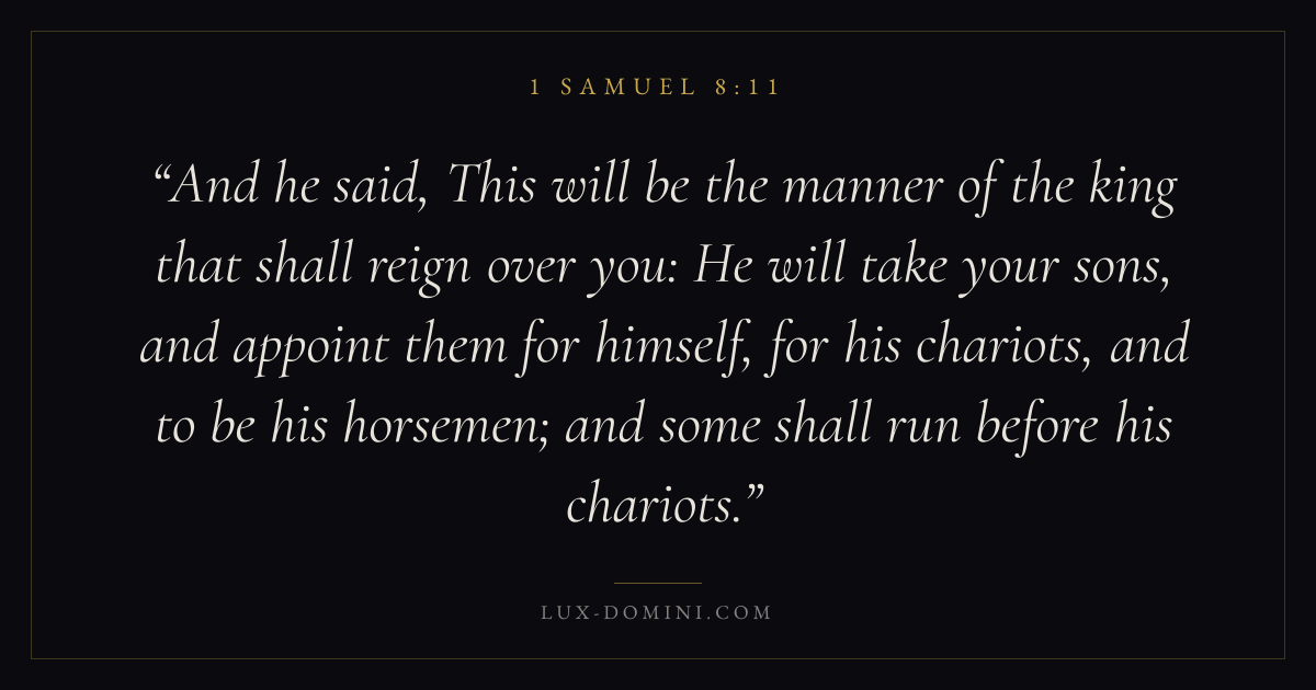And he said, This will be the manner of the king that shall reign over you: He will take your sons, and appoint them for himself, for his chariots, and to be his horsemen; and some shall run before his chariots.