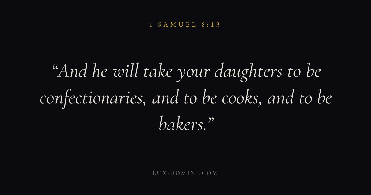 Books / 1 Samuel / Chapter 8 / Verse 13 ← 1 Samuel 8:12 1 Samuel 8:13 1 Samuel 8:14 → And he will take your daughters to be confectionaries, and to be cooks, and to be bakers. Download verse card Share on Twitter Share on Facebook Pin it ✦ Key themes HopeLeadershipAnointingObedience Read with 1 Samuel 8:101 Samuel 8:11Romans 8:24Revelation 21:4 Related topics Bible verses about hopeBible verses about leadershipBible verses about obedience ✦ 1 Samuel Chapter 8 verses V. 1 V. 2 V. 3 V. 4 V. 5 V. 6 V. 7 V. 8 V. 9 V. 10 V. 11 V. 12 V. 13 V. 14 V. 15 V. 16 V. 17 V. 18 V. 19 V. 20 V. 21 V. 22