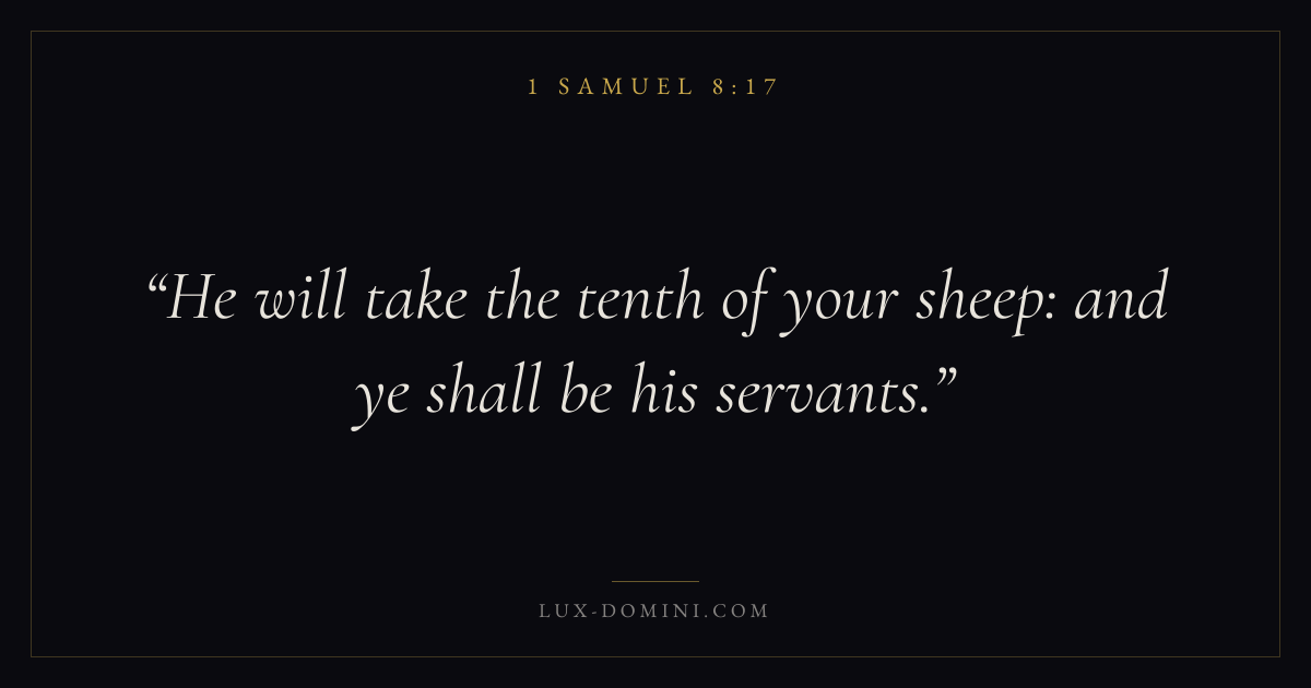 Books / 1 Samuel / Chapter 8 / Verse 17 ← 1 Samuel 8:16 1 Samuel 8:17 1 Samuel 8:18 → He will take the tenth of your sheep: and ye shall be his servants. Download verse card Share on Twitter Share on Facebook Pin it ✦ Key themes HopeLeadershipAnointingObedience Read with 1 Samuel 8:18Romans 8:24Revelation 21:4 Related topics Bible verses about hopeBible verses about leadershipBible verses about obedience ✦ 1 Samuel Chapter 8 verses V. 1 V. 2 V. 3 V. 4 V. 5 V. 6 V. 7 V. 8 V. 9 V. 10 V. 11 V. 12 V. 13 V. 14 V. 15 V. 16 V. 17 V. 18 V. 19 V. 20 V. 21 V. 22