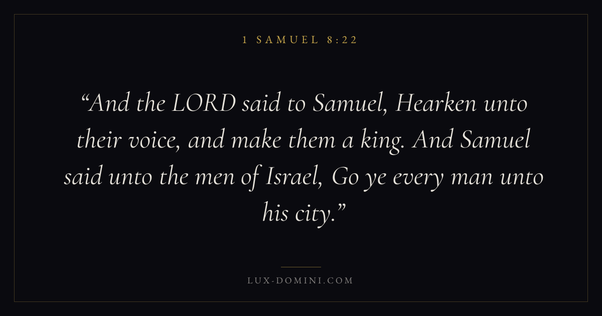 And the LORD said to Samuel, Hearken unto their voice, and make them a king. And Samuel said unto the men of Israel, Go ye every man unto his city.