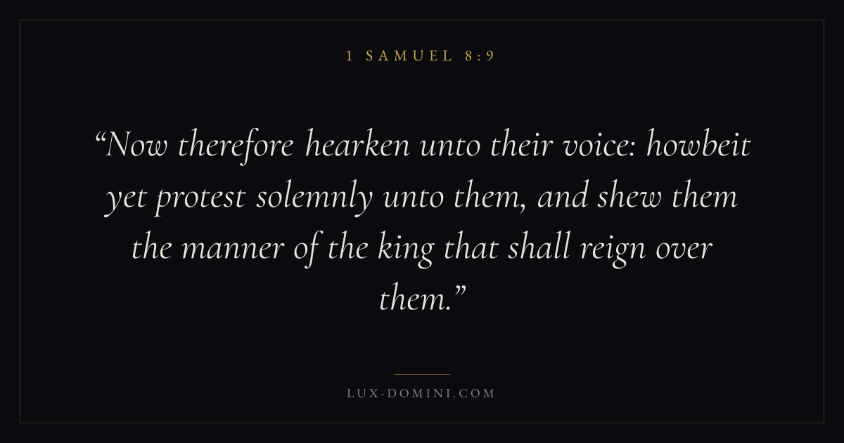 Now therefore hearken unto their voice: howbeit yet protest solemnly unto them, and shew them the manner of the king that shall reign over them.