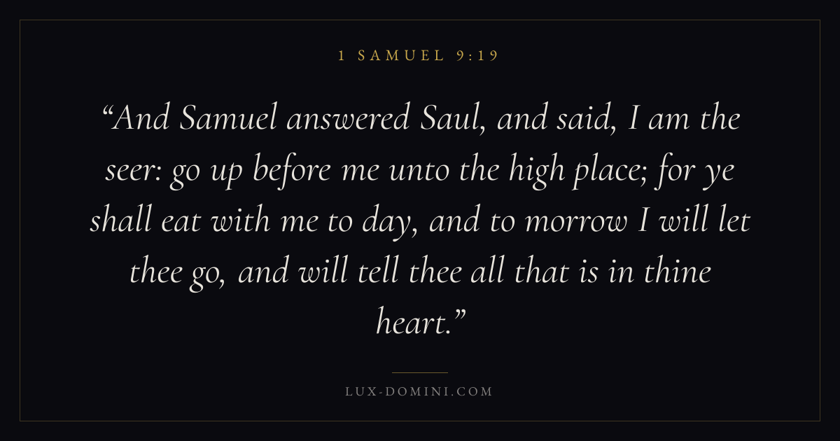 And Samuel answered Saul, and said, I am the seer: go up before me unto the high place; for ye shall eat with me to day, and to morrow I will let thee go, and will tell thee all that is in thine heart.