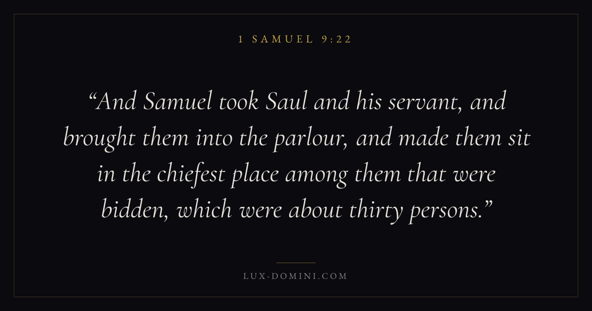 And Samuel took Saul and his servant, and brought them into the parlour, and made them sit in the chiefest place among them that were bidden, which were about thirty persons.