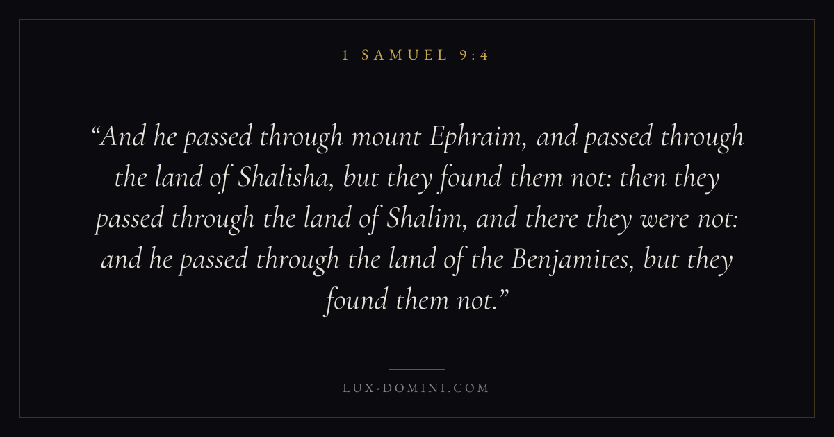And he passed through mount Ephraim, and passed through the land of Shalisha, but they found them not: then they passed through the land of Shalim, and there they were not: and he passed through the land of the Benjamites, but they found them not.