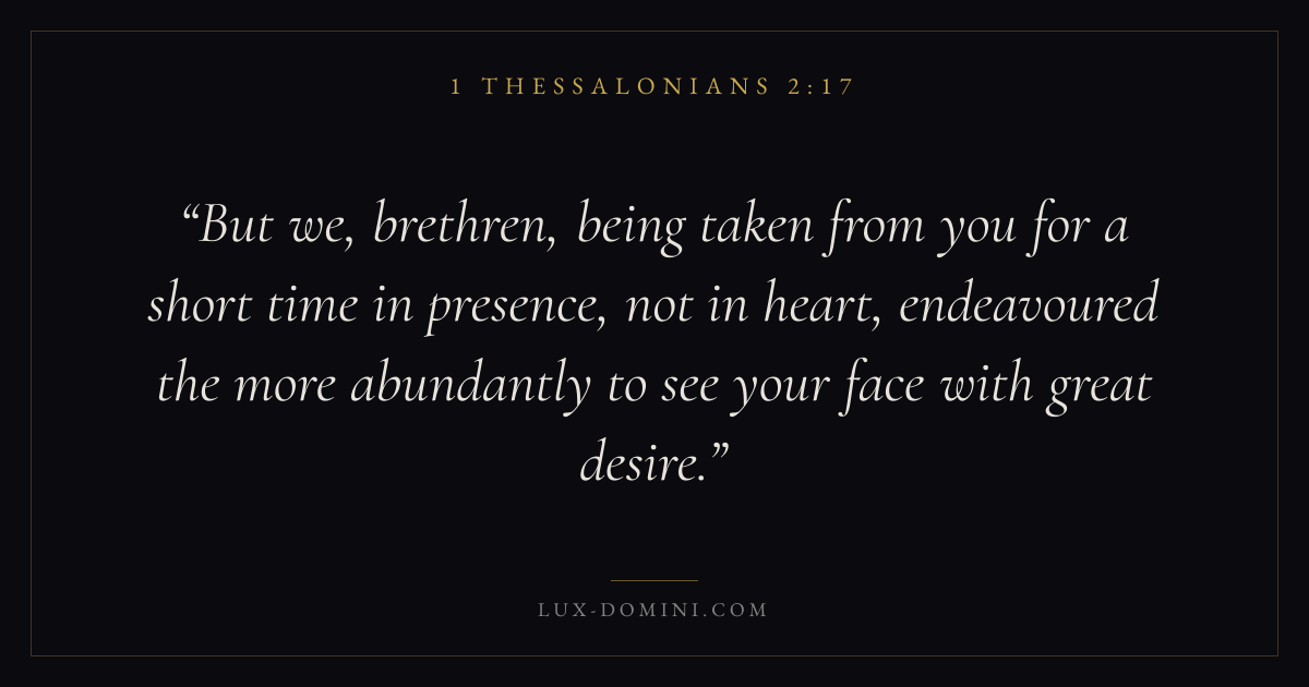 But we, brethren, being taken from you for a short time in presence, not in heart, endeavoured the more abundantly to see your face with great desire.