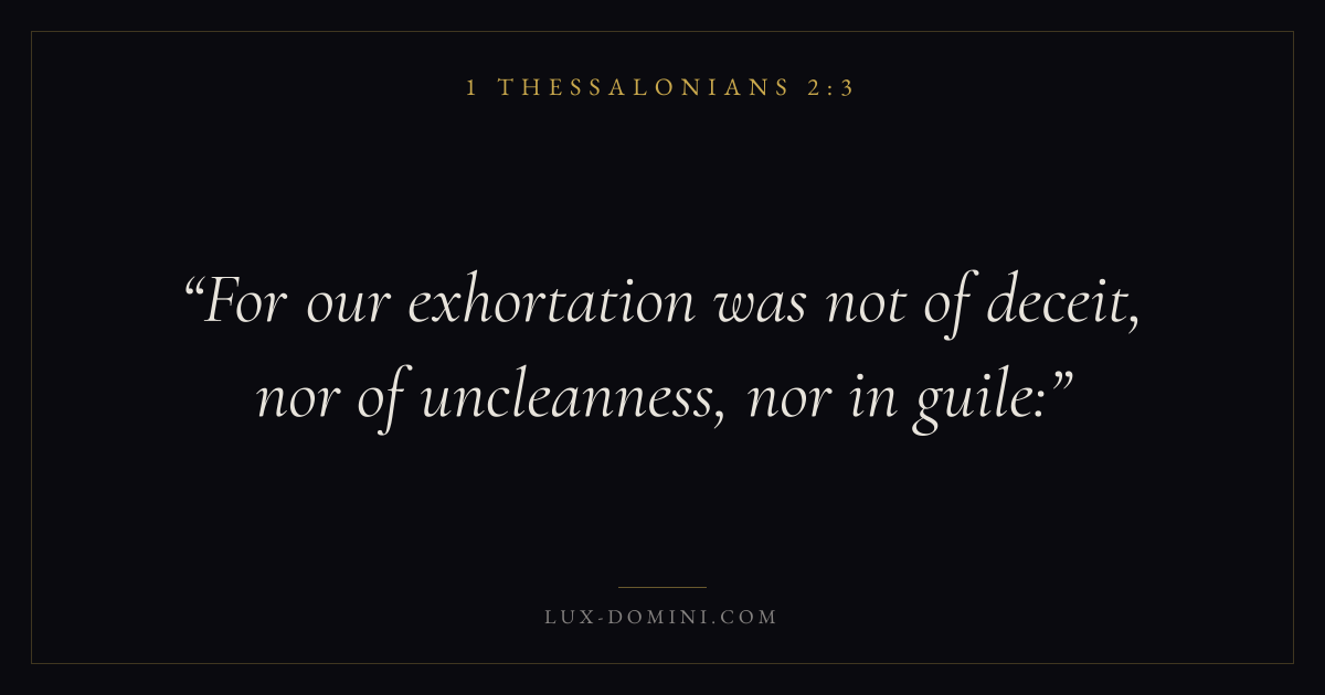 Books / 1 Thessalonians / Chapter 2 / Verse 3 ← 1 Thessalonians 2:2 1 Thessalonians 2:3 1 Thessalonians 2:4 → For our exhortation was not of deceit, nor of uncleanness, nor in guile: Download verse card Share on Twitter Share on Facebook Pin it ✦ Key themes LoveHopeSuffering and trialsHoliness Read with 1 Thessalonians 2:11 Thessalonians 2:2John 3:161 Corinthians 13:4 Related topics Bible verses about loveBible verses about hopeBible verses about suffering and trials ✦ 1 Thessalonians Chapter 2 verses V. 1 V. 2 V. 3 V. 4 V. 5 V. 6 V. 7 V. 8 V. 9 V. 10 V. 11 V. 12 V. 13 V. 14 V. 15 V. 16 V. 17 V. 18 V. 19 V. 20