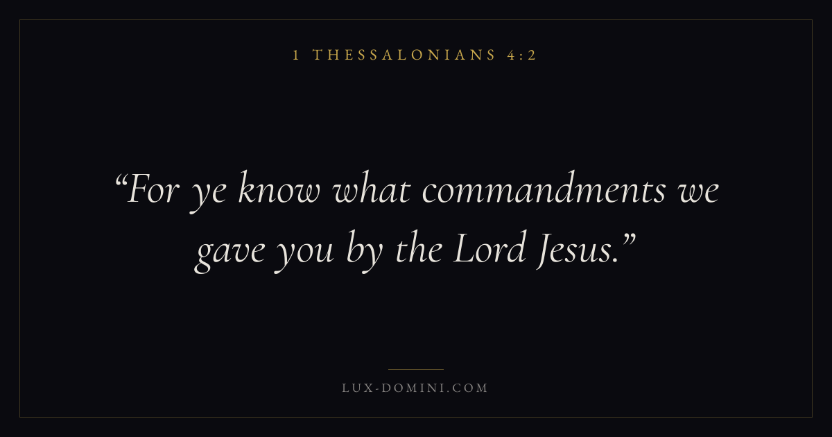 Books / 1 Thessalonians / Chapter 4 / Verse 2 ← 1 Thessalonians 4:1 1 Thessalonians 4:2 1 Thessalonians 4:3 → For ye know what commandments we gave you by the Lord Jesus. Download verse card Share on Twitter Share on Facebook Pin it ✦ Key themes LoveFaithHopeHoliness Read with 1 Thessalonians 4:11 Thessalonians 4:3John 3:161 Corinthians 13:4 Related topics Bible verses about loveBible verses about faithBible verses about hope ✦ 1 Thessalonians Chapter 4 verses V. 1 V. 2 V. 3 V. 4 V. 5 V. 6 V. 7 V. 8 V. 9 V. 10 V. 11 V. 12 V. 13 V. 14 V. 15 V. 16 V. 17 V. 18