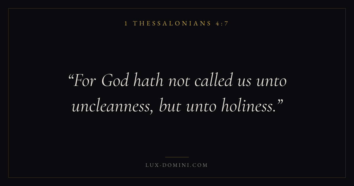 Books / 1 Thessalonians / Chapter 4 / Verse 7 ← 1 Thessalonians 4:6 1 Thessalonians 4:7 1 Thessalonians 4:8 → For God hath not called us unto uncleanness, but unto holiness. Download verse card Share on Twitter Share on Facebook Pin it ✦ Key themes LoveFaithHopeHoliness Read with 1 Thessalonians 4:6John 3:161 Corinthians 13:4Hebrews 11:1 Related topics Bible verses about loveBible verses about faithBible verses about hope ✦ 1 Thessalonians Chapter 4 verses V. 1 V. 2 V. 3 V. 4 V. 5 V. 6 V. 7 V. 8 V. 9 V. 10 V. 11 V. 12 V. 13 V. 14 V. 15 V. 16 V. 17 V. 18