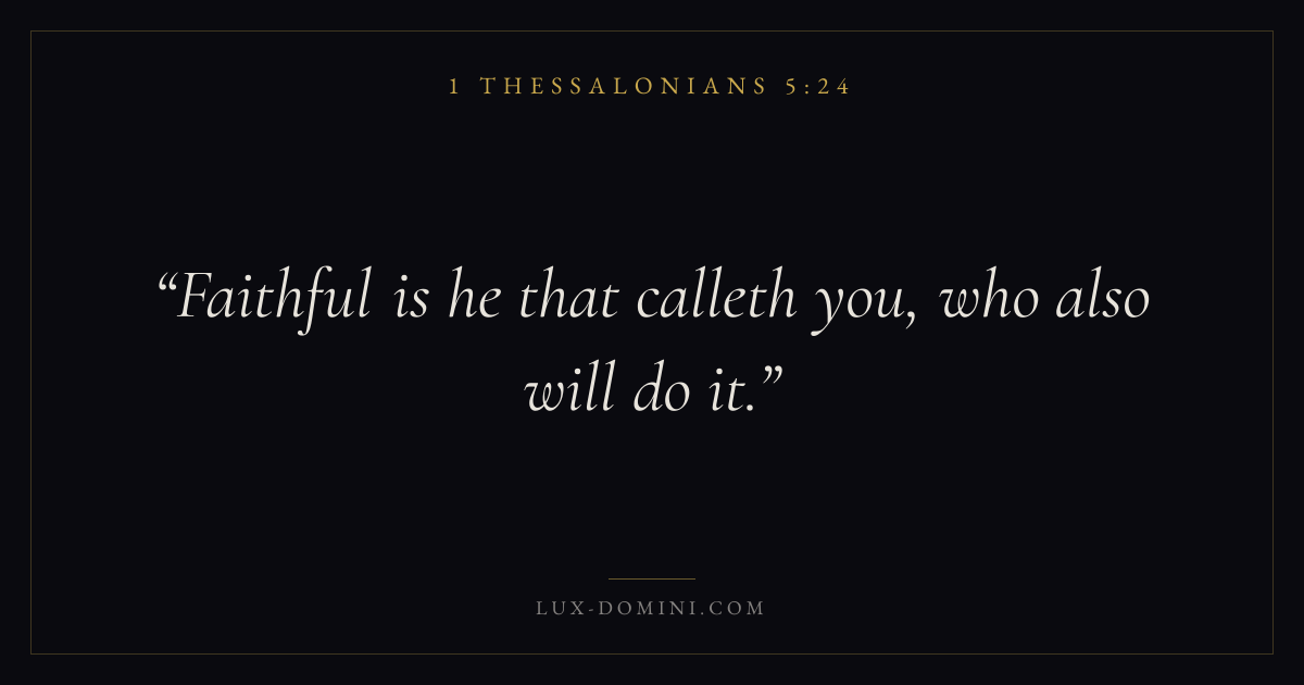 Books / 1 Thessalonians / Chapter 5 / Verse 24 ← 1 Thessalonians 5:23 1 Thessalonians 5:24 1 Thessalonians 5:25 → Faithful is he that calleth you, who also will do it. Download verse card Share on Twitter Share on Facebook Pin it ✦ Key themes LoveHopePrayerHoliness Read with 1 Thessalonians 5:25John 3:161 Corinthians 13:4Romans 8:24 Related topics Bible verses about loveBible verses about hopeBible verses about prayer ✦ 1 Thessalonians Chapter 5 verses V. 1 V. 2 V. 3 V. 4 V. 5 V. 6 V. 7 V. 8 V. 9 V. 10 V. 11 V. 12 V. 13 V. 14 V. 15 V. 16 V. 17 V. 18 V. 19 V. 20 V. 21 V. 22 V. 23 V. 24 V. 25 V. 26 V. 27 V. 28
