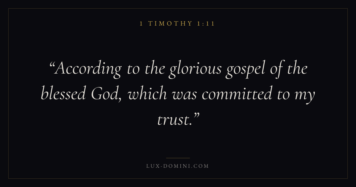 Books / 1 Timothy / Chapter 1 / Verse 11 ← 1 Timothy 1:10 1 Timothy 1:11 1 Timothy 1:12 → According to the glorious gospel of the blessed God, which was committed to my trust. Download verse card Share on Twitter Share on Facebook Pin it ✦ Key themes LoveFaithPrayerChurch order Read with 1 Timothy 1:81 Timothy 1:9John 3:161 Corinthians 13:4 Related topics Bible verses about loveBible verses about faithBible verses about prayer ✦ 1 Timothy Chapter 1 verses V. 1 V. 2 V. 3 V. 4 V. 5 V. 6 V. 7 V. 8 V. 9 V. 10 V. 11 V. 12 V. 13 V. 14 V. 15 V. 16 V. 17 V. 18 V. 19 V. 20