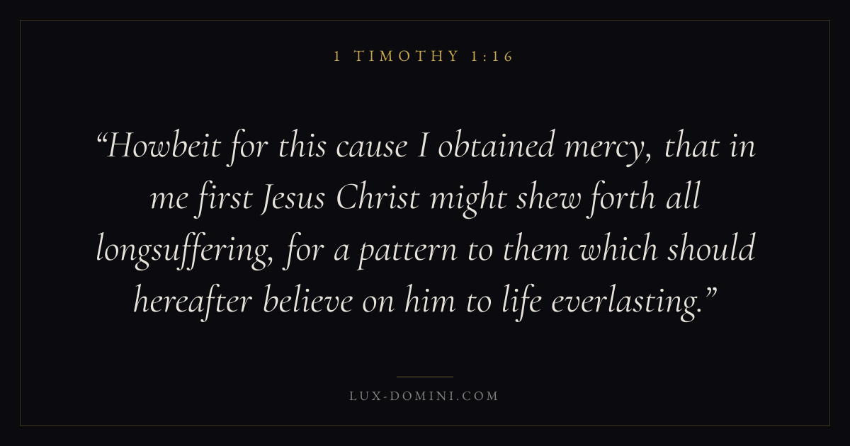 Howbeit for this cause I obtained mercy, that in me first Jesus Christ might shew forth all longsuffering, for a pattern to them which should hereafter believe on him to life everlasting.