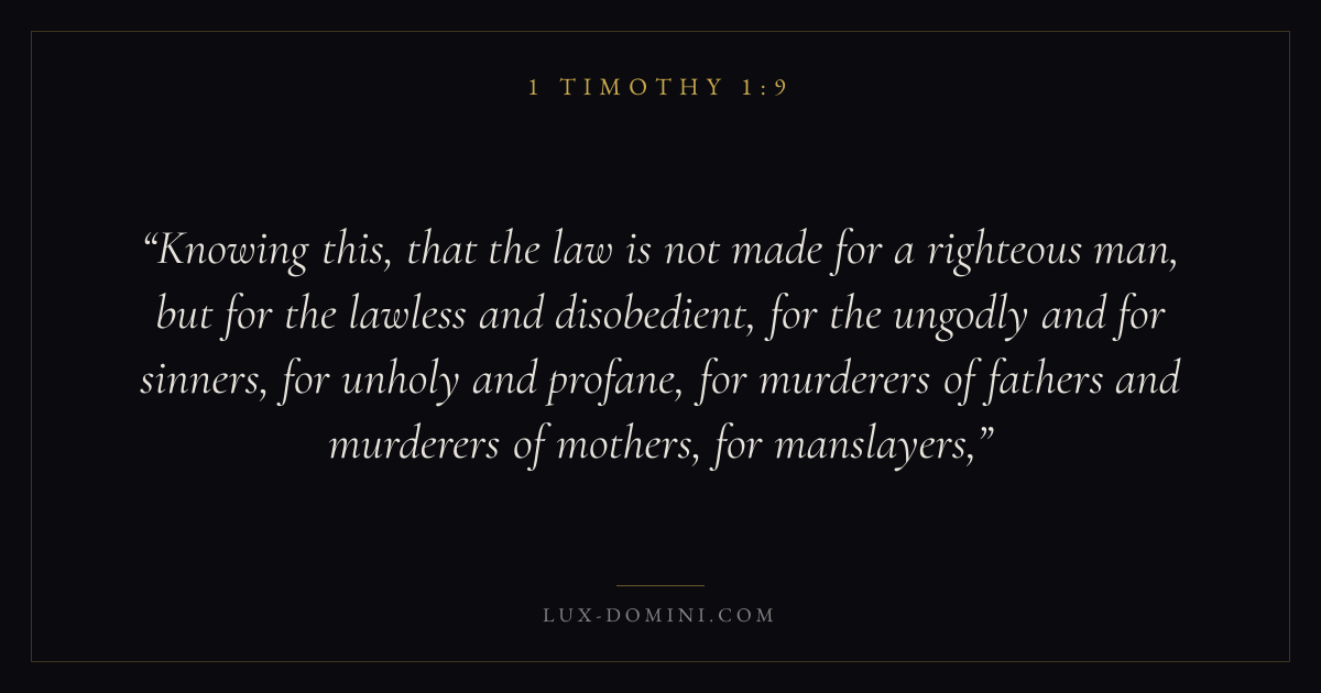 Knowing this, that the law is not made for a righteous man, but for the lawless and disobedient, for the ungodly and for sinners, for unholy and profane, for murderers of fathers and murderers of mothers, for manslayers,