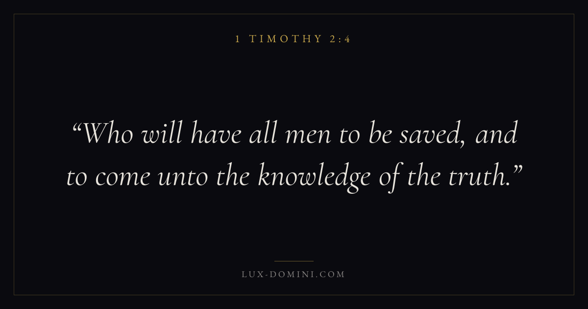 Books / 1 Timothy / Chapter 2 / Verse 4 ← 1 Timothy 2:3 1 Timothy 2:4 1 Timothy 2:5 → Who will have all men to be saved, and to come unto the knowledge of the truth. Download verse card Share on Twitter Share on Facebook Pin it ✦ Key themes PrayerWisdomSalvationTruthChurch order Read with 1 Timothy 2:11 Timothy 2:2Matthew 6:9Luke 18:1 Related topics Bible verses about prayerBible verses about wisdomBible verses about salvationBible verses about truth ✦ 1 Timothy Chapter 2 verses V. 1 V. 2 V. 3 V. 4 V. 5 V. 6 V. 7 V. 8 V. 9 V. 10 V. 11 V. 12 V. 13 V. 14 V. 15