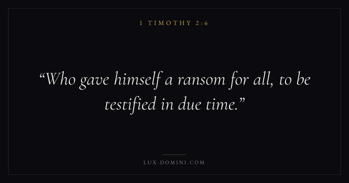 Books / 1 Timothy / Chapter 2 / Verse 6 ← 1 Timothy 2:5 1 Timothy 2:6 1 Timothy 2:7 → Who gave himself a ransom for all, to be testified in due time. Download verse card Share on Twitter Share on Facebook Pin it ✦ Key themes PrayerChurch orderSound doctrineGodliness Read with 1 Timothy 2:71 Timothy 2:8Matthew 6:9Luke 18:1 Related topics Bible verses about prayer ✦ 1 Timothy Chapter 2 verses V. 1 V. 2 V. 3 V. 4 V. 5 V. 6 V. 7 V. 8 V. 9 V. 10 V. 11 V. 12 V. 13 V. 14 V. 15