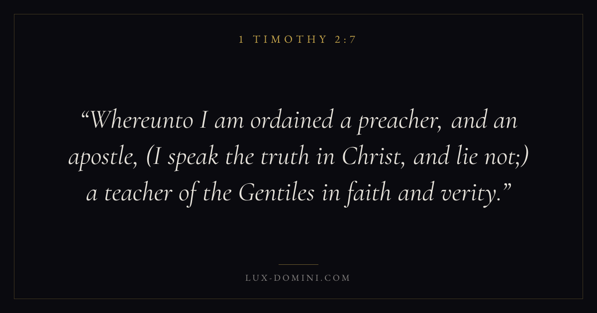 Whereunto I am ordained a preacher, and an apostle, (I speak the truth in Christ, and lie not;) a teacher of the Gentiles in faith and verity.