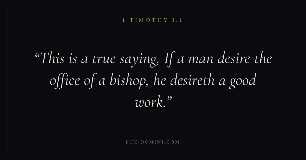 Books / 1 Timothy / Chapter 3 / Verse 1 ← 1 Timothy 2:15 1 Timothy 3:1 1 Timothy 3:2 → This is a true saying, If a man desire the office of a bishop, he desireth a good work. Download verse card Share on Twitter Share on Facebook Pin it ✦ Key themes LovePrayerTruthChurch order Read with John 3:161 Corinthians 13:4Matthew 6:9Luke 18:1 Related topics Bible verses about loveBible verses about prayerBible verses about truth ✦ 1 Timothy Chapter 3 verses V. 1 V. 2 V. 3 V. 4 V. 5 V. 6 V. 7 V. 8 V. 9 V. 10 V. 11 V. 12 V. 13 V. 14 V. 15 V. 16