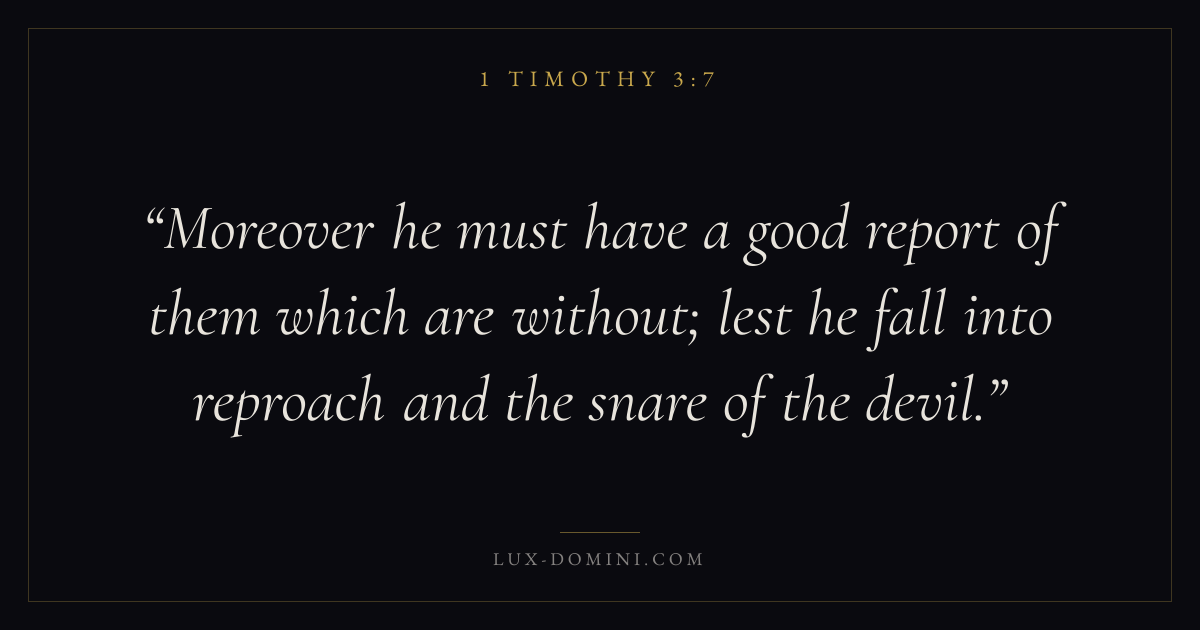 Moreover he must have a good report of them which are without; lest he fall into reproach and the snare of the devil.