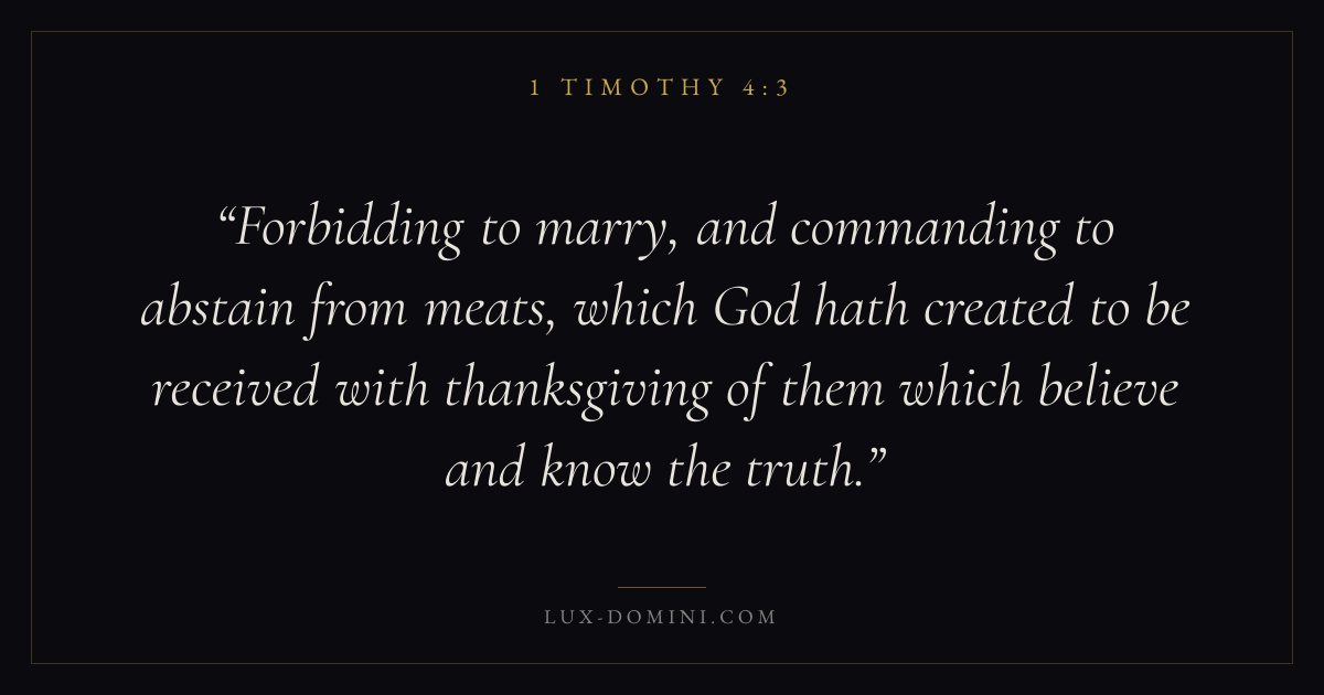 Forbidding to marry, and commanding to abstain from meats, which God hath created to be received with thanksgiving of them which believe and know the truth.