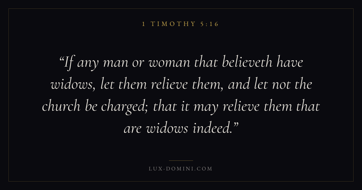 If any man or woman that believeth have widows, let them relieve them, and let not the church be charged; that it may relieve them that are widows indeed.