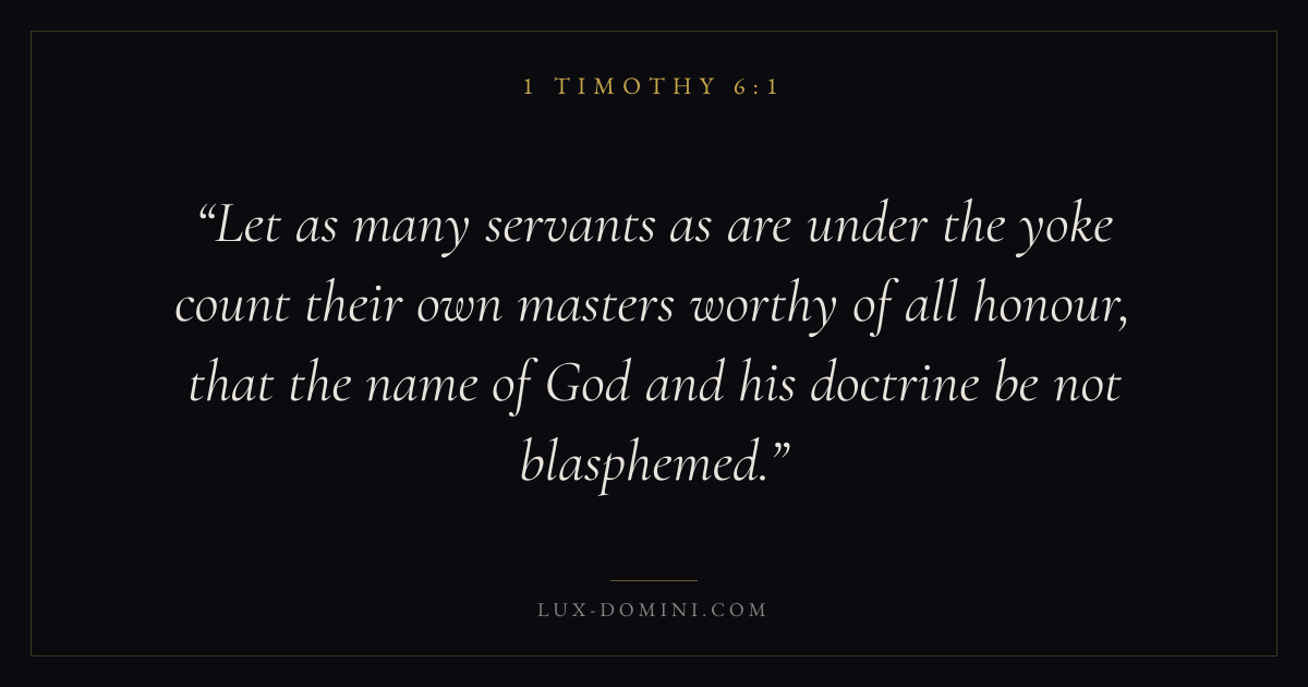 Let as many servants as are under the yoke count their own masters worthy of all honour, that the name of God and his doctrine be not blasphemed.