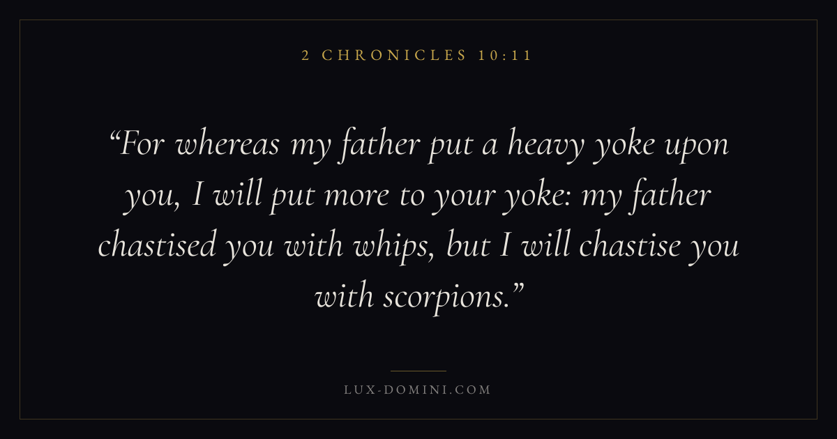 For whereas my father put a heavy yoke upon you, I will put more to your yoke: my father chastised you with whips, but I will chastise you with scorpions.