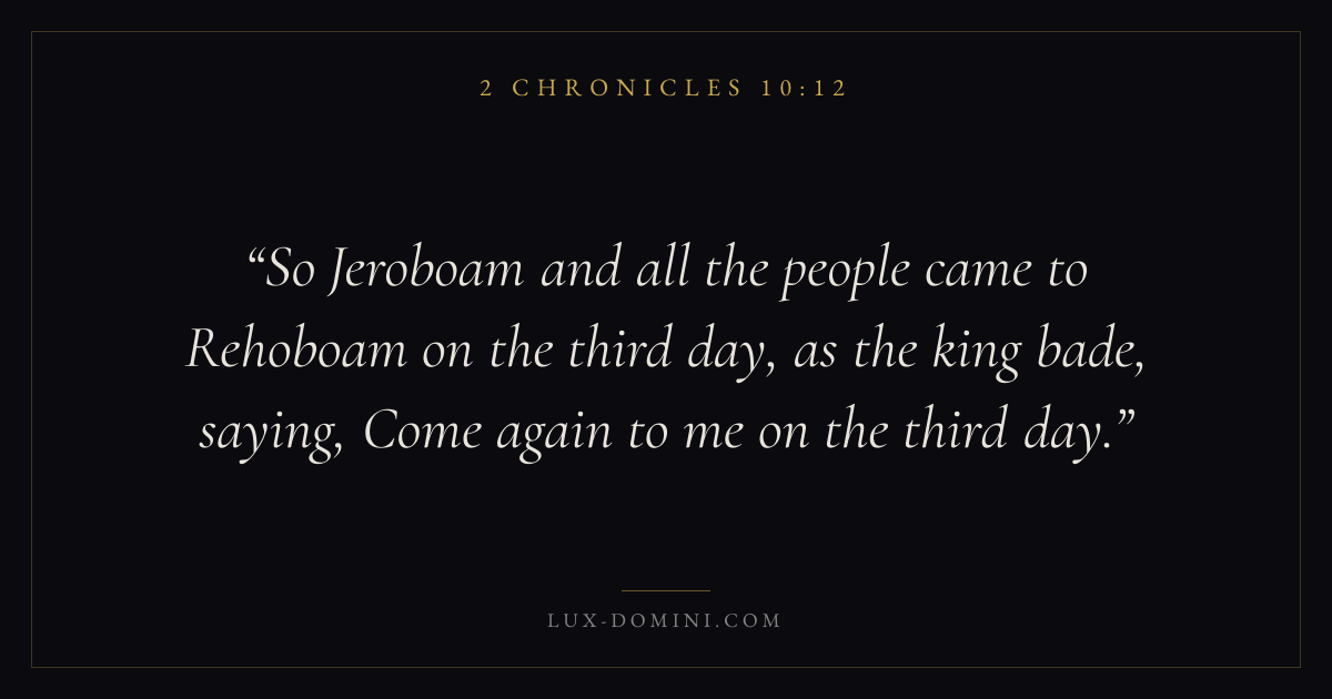 So Jeroboam and all the people came to Rehoboam on the third day, as the king bade, saying, Come again to me on the third day.