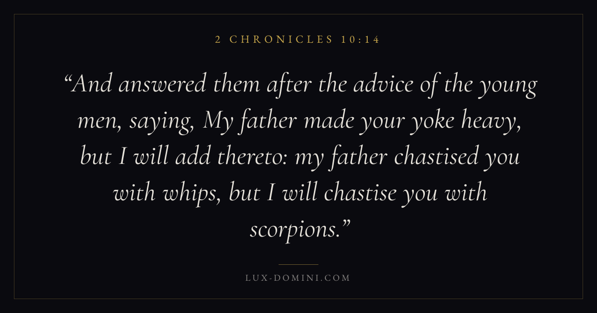 And answered them after the advice of the young men, saying, My father made your yoke heavy, but I will add thereto: my father chastised you with whips, but I will chastise you with scorpions.