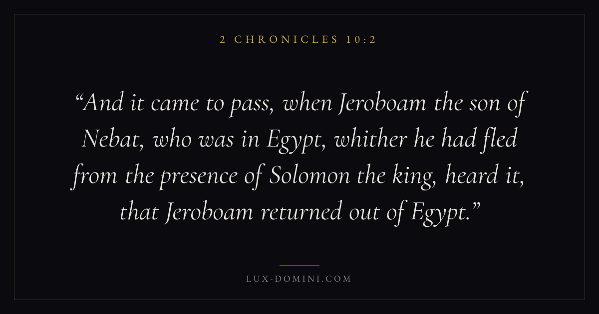 And it came to pass, when Jeroboam the son of Nebat, who was in Egypt, whither he had fled from the presence of Solomon the king, heard it, that Jeroboam returned out of Egypt.