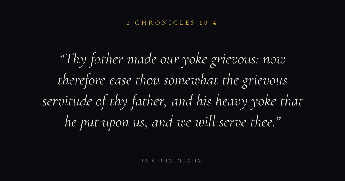 Thy father made our yoke grievous: now therefore ease thou somewhat the grievous servitude of thy father, and his heavy yoke that he put upon us, and we will serve thee.