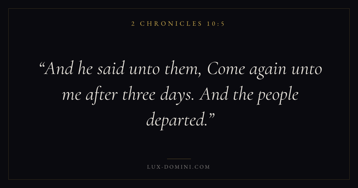 Books / 2 Chronicles / Chapter 10 / Verse 5 ← 2 Chronicles 10:4 2 Chronicles 10:5 2 Chronicles 10:6 → And he said unto them, Come again unto me after three days. And the people departed. Download verse card Share on Twitter Share on Facebook Pin it ✦ Key themes PrayerJustice and mercyTempleReform Read with 2 Chronicles 10:12 Chronicles 10:2Matthew 6:9Luke 18:1 Related topics Bible verses about prayerBible verses about justice and mercy ✦ 2 Chronicles Chapter 10 verses V. 1 V. 2 V. 3 V. 4 V. 5 V. 6 V. 7 V. 8 V. 9 V. 10 V. 11 V. 12 V. 13 V. 14 V. 15 V. 16 V. 17 V. 18 V. 19