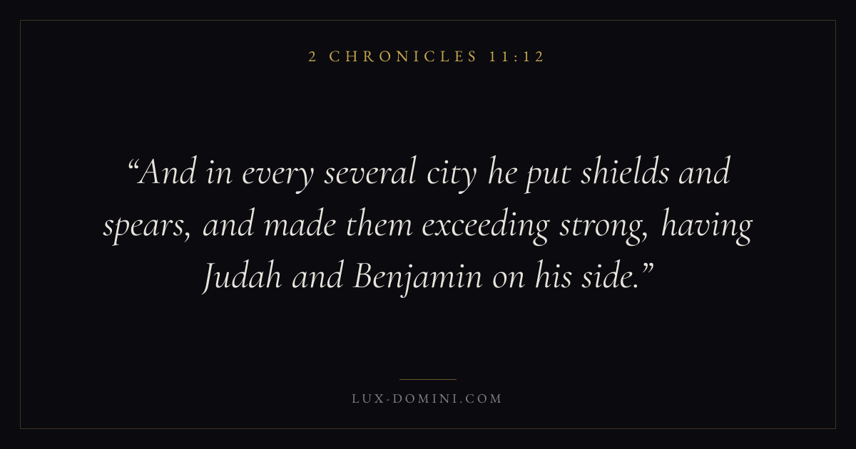 And in every several city he put shields and spears, and made them exceeding strong, having Judah and Benjamin on his side.