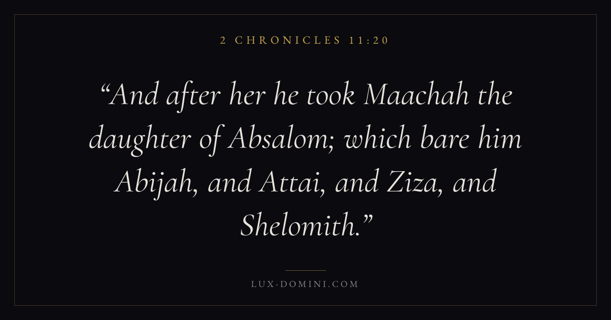 And after her he took Maachah the daughter of Absalom; which bare him Abijah, and Attai, and Ziza, and Shelomith.