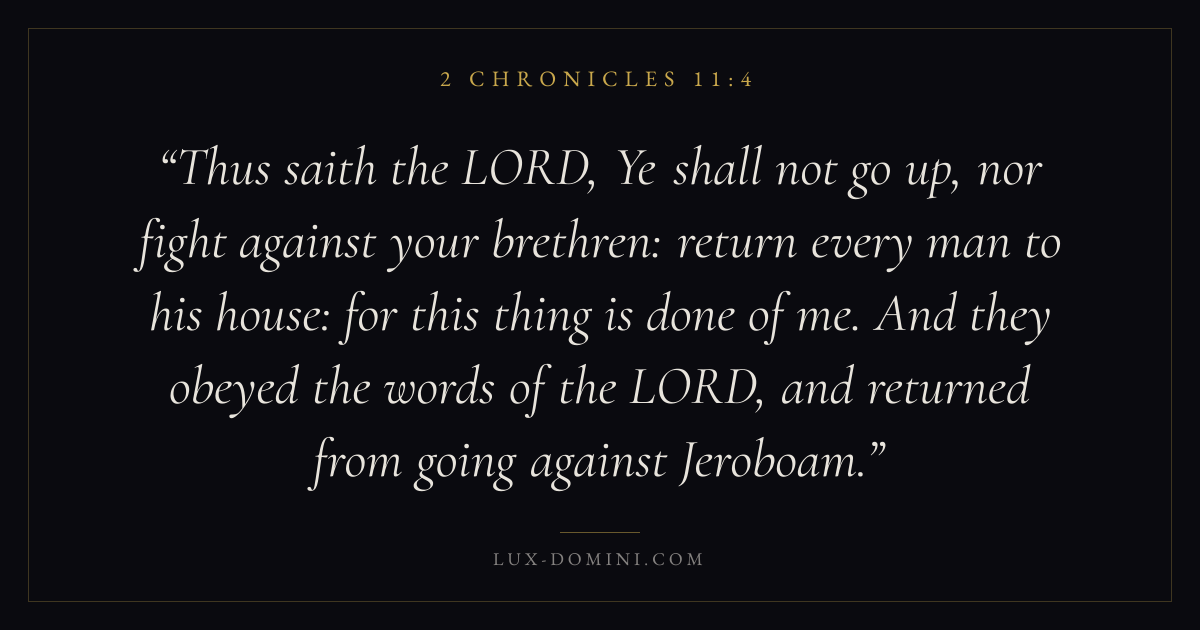 Thus saith the LORD, Ye shall not go up, nor fight against your brethren: return every man to his house: for this thing is done of me. And they obeyed the words of the LORD, and returned from going against Jeroboam.