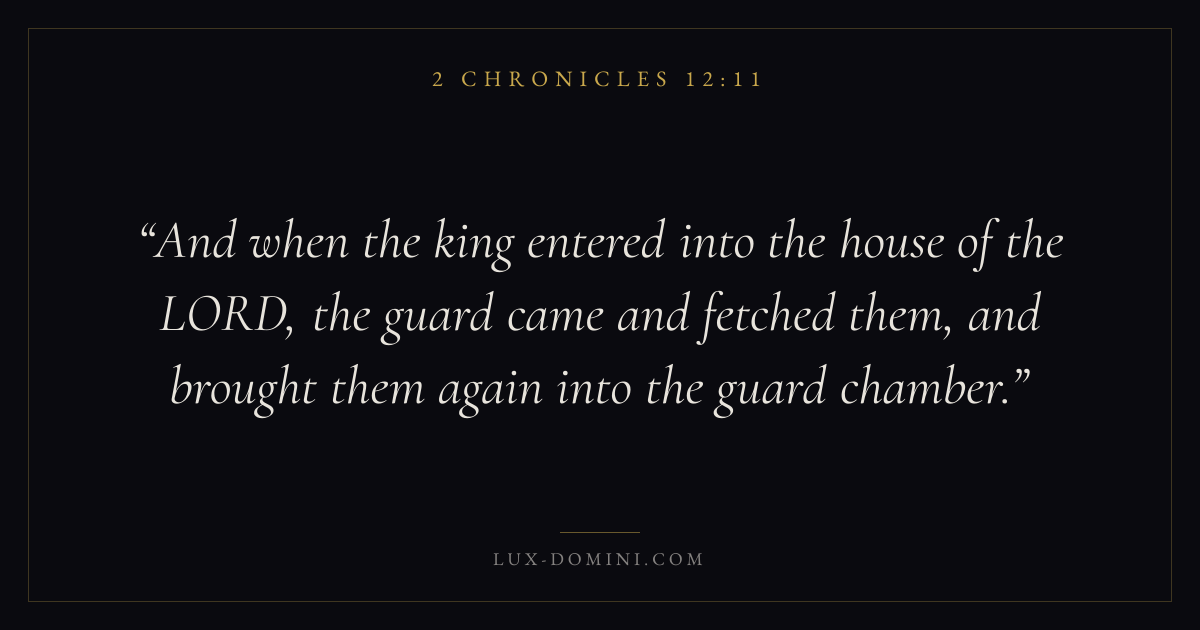 And when the king entered into the house of the LORD, the guard came and fetched them, and brought them again into the guard chamber.
