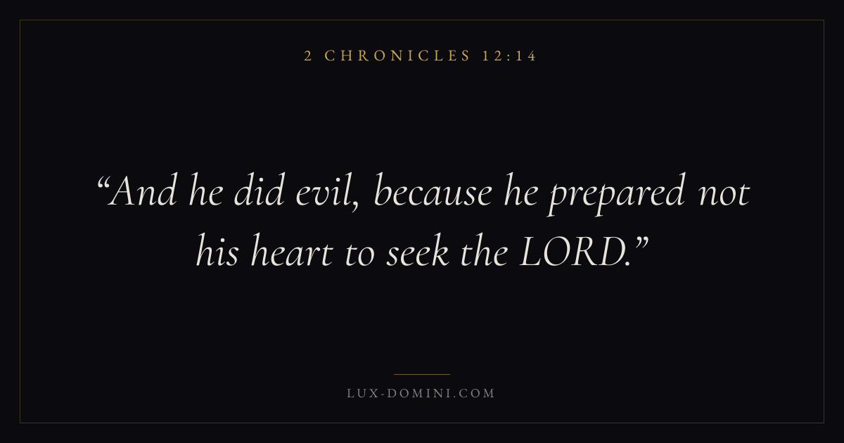 Books / 2 Chronicles / Chapter 12 / Verse 14 ← 2 Chronicles 12:13 2 Chronicles 12:14 2 Chronicles 12:15 → And he did evil, because he prepared not his heart to seek the LORD. Download verse card Share on Twitter Share on Facebook Pin it ✦ Key themes PrayerJustice and mercyTempleReform Read with 2 Chronicles 12:132 Chronicles 12:15Matthew 6:9Luke 18:1 Related topics Bible verses about prayerBible verses about justice and mercy ✦ 2 Chronicles Chapter 12 verses V. 1 V. 2 V. 3 V. 4 V. 5 V. 6 V. 7 V. 8 V. 9 V. 10 V. 11 V. 12 V. 13 V. 14 V. 15 V. 16