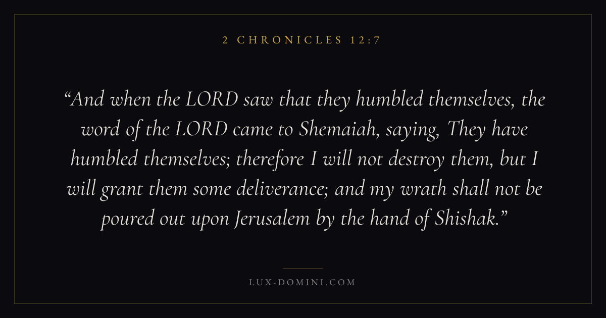 And when the LORD saw that they humbled themselves, the word of the LORD came to Shemaiah, saying, They have humbled themselves; therefore I will not destroy them, but I will grant them some deliverance; and my wrath shall not be poured out upon Jerusalem by the hand of Shishak.