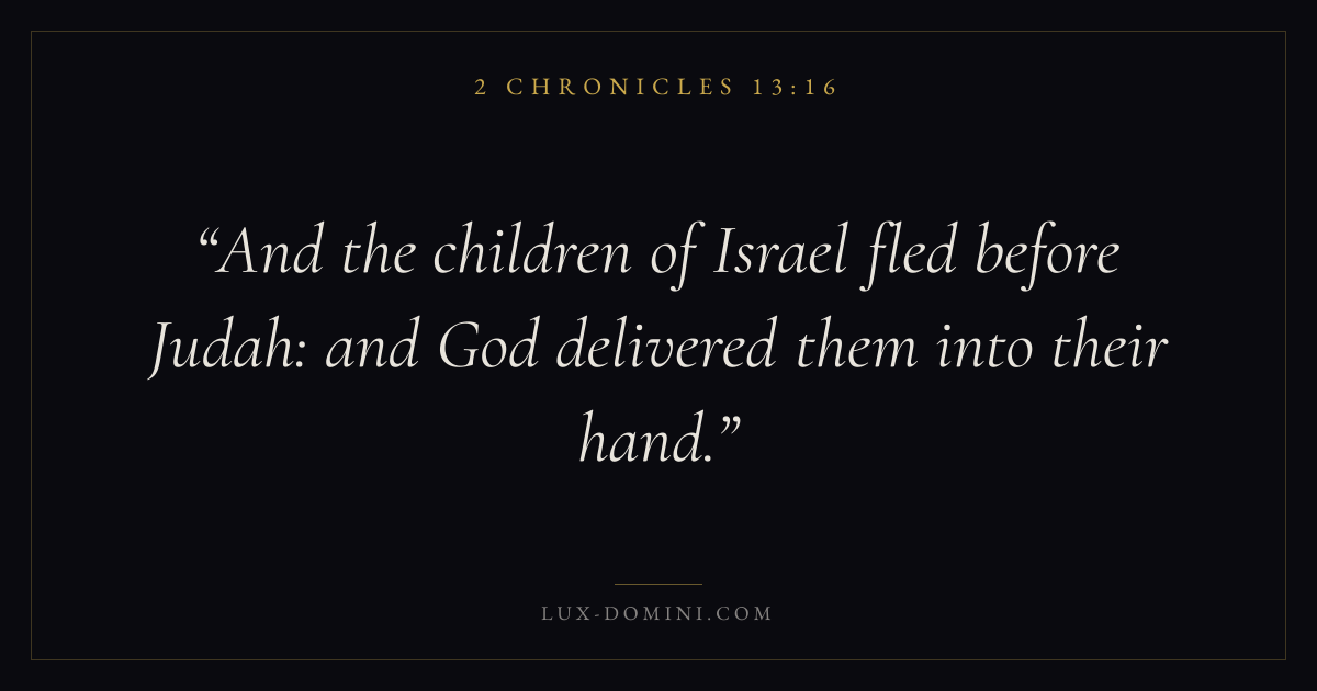 Books / 2 Chronicles / Chapter 13 / Verse 16 ← 2 Chronicles 13:15 2 Chronicles 13:16 2 Chronicles 13:17 → And the children of Israel fled before Judah: and God delivered them into their hand. Download verse card Share on Twitter Share on Facebook Pin it ✦ Key themes PrayerJustice and mercyTempleReform Read with 2 Chronicles 13:132 Chronicles 13:14Matthew 6:9Luke 18:1 Related topics Bible verses about prayerBible verses about justice and mercy ✦ 2 Chronicles Chapter 13 verses V. 1 V. 2 V. 3 V. 4 V. 5 V. 6 V. 7 V. 8 V. 9 V. 10 V. 11 V. 12 V. 13 V. 14 V. 15 V. 16 V. 17 V. 18 V. 19 V. 20 V. 21 V. 22