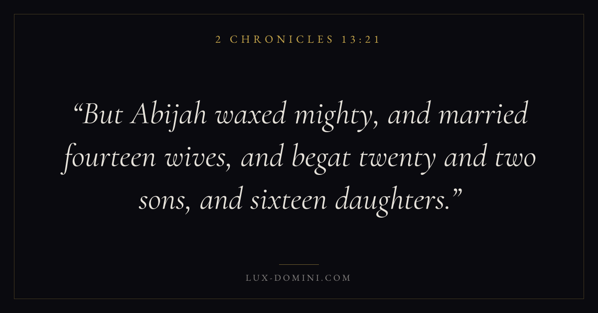 But Abijah waxed mighty, and married fourteen wives, and begat twenty and two sons, and sixteen daughters.