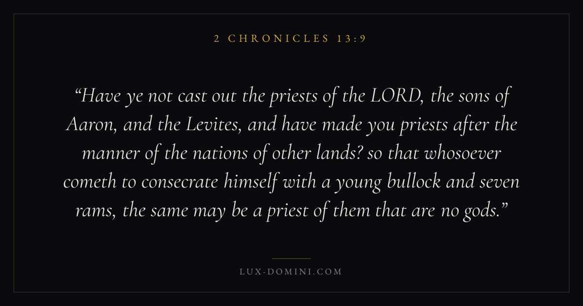 Have ye not cast out the priests of the LORD, the sons of Aaron, and the Levites, and have made you priests after the manner of the nations of other lands? so that whosoever cometh to consecrate himself with a young bullock and seven rams, the same may be a priest of them that are no gods.