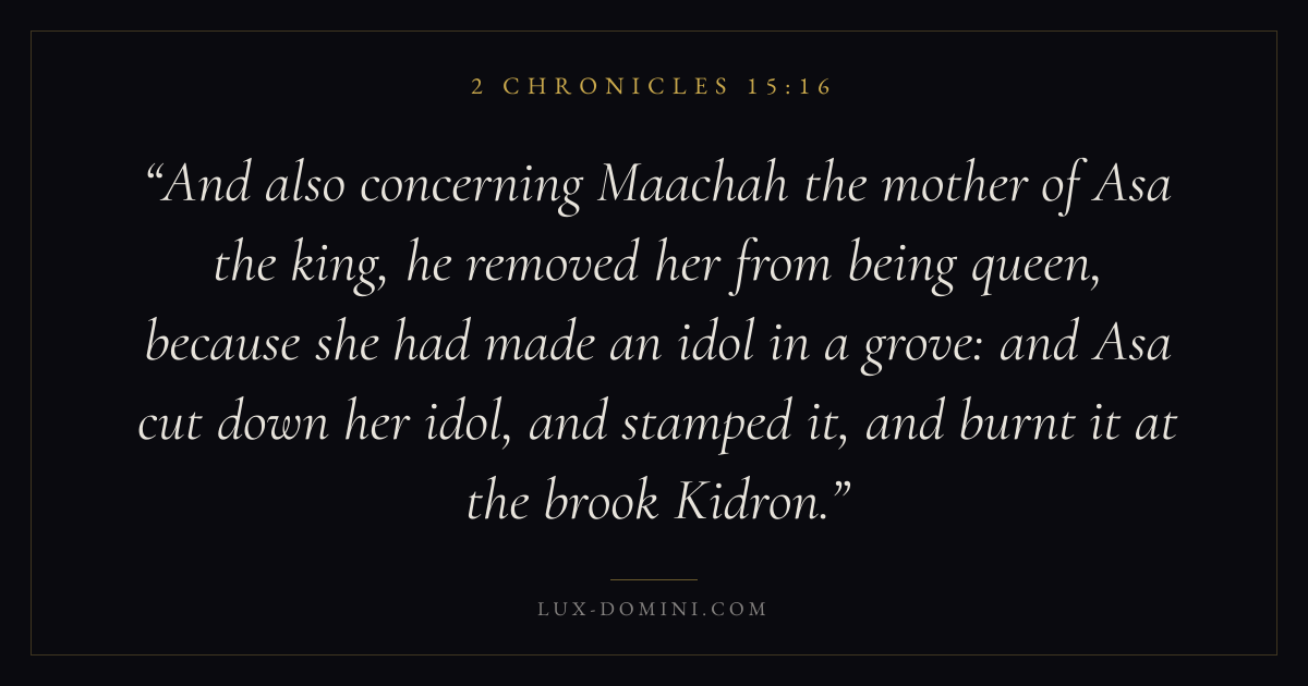 And also concerning Maachah the mother of Asa the king, he removed her from being queen, because she had made an idol in a grove: and Asa cut down her idol, and stamped it, and burnt it at the brook Kidron.
