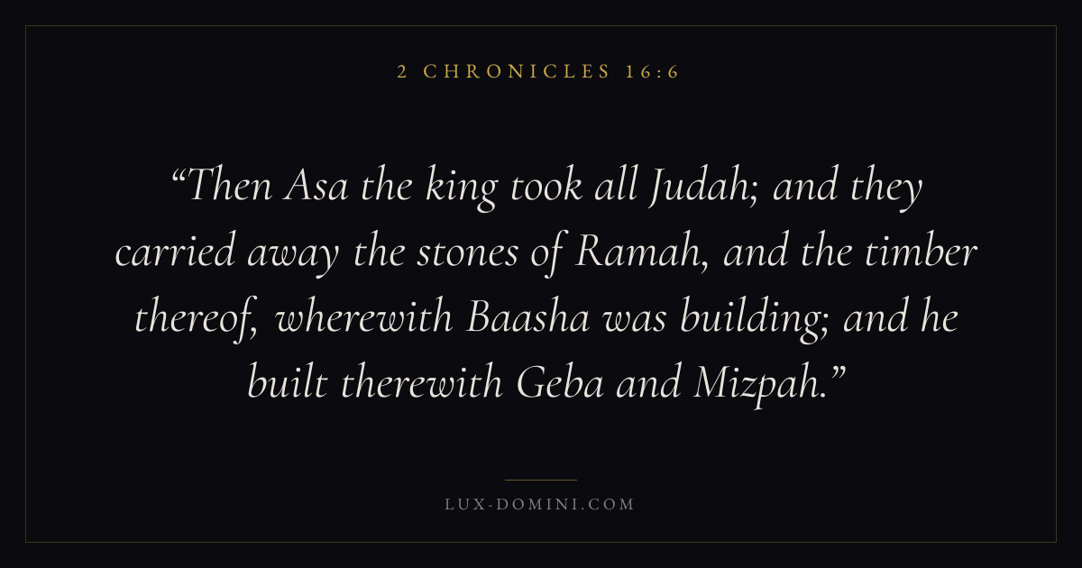 Then Asa the king took all Judah; and they carried away the stones of Ramah, and the timber thereof, wherewith Baasha was building; and he built therewith Geba and Mizpah.
